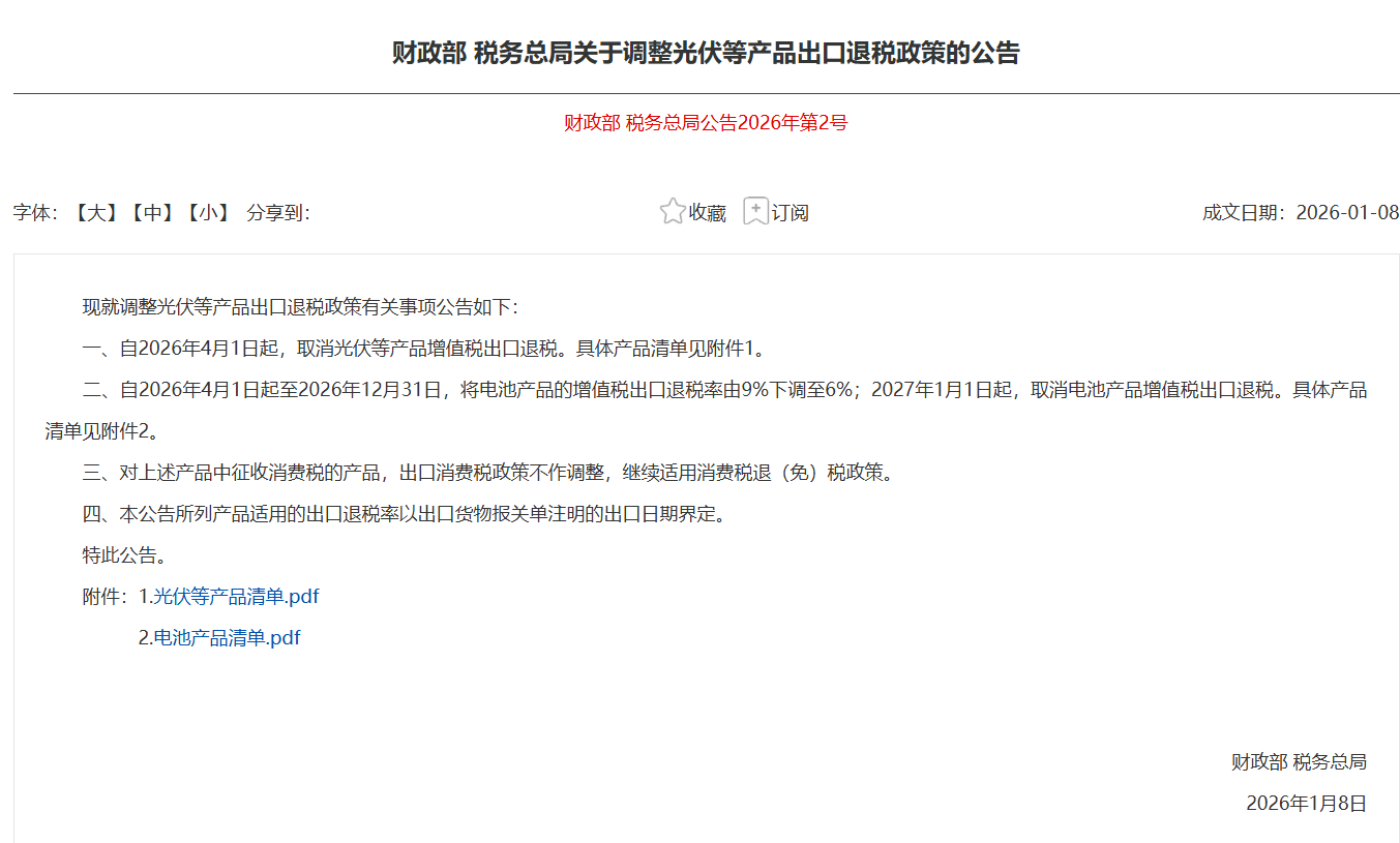 一、自2026年4月1日起,取消光伏等产品增值税出口退税。具体产品清单见附件1。